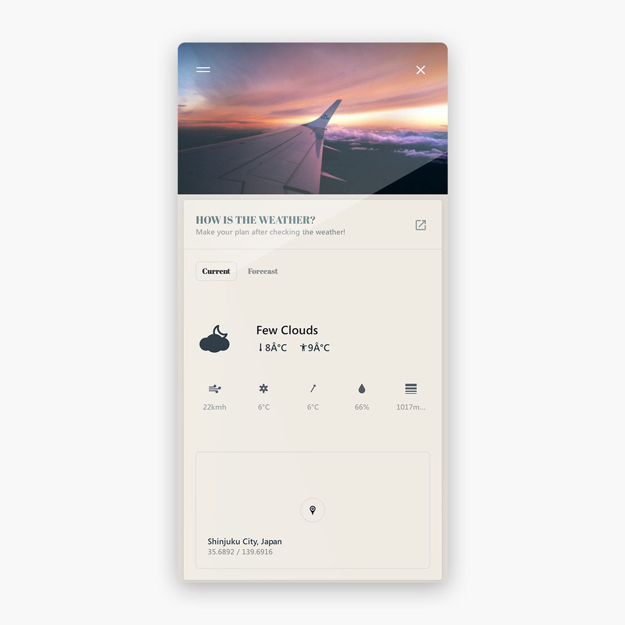 現在の天気状況と週間予報をタブで切り替えて表示します。天気アイコン・最低/最高気温に加え、風速・降水確率・湿度・気圧といった詳細気象データも確認可能です。取得した場所名と座標も合わせて表示されるため、どの地点の情報かが明確です。