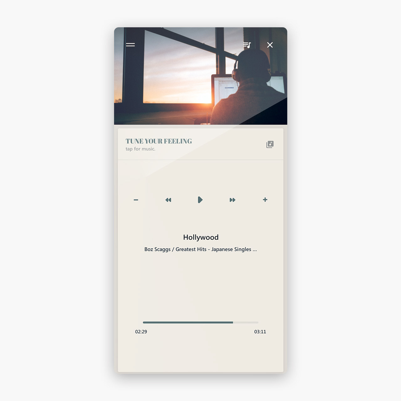 再生中の曲名・アーティスト名・アルバム名と、プログレスバー・経過時間を一目で確認できます。再生・停止・スキップの操作ボタンはカード内にシンプルに配置しており、画面を切り替えることなく音楽をコントロールできます。