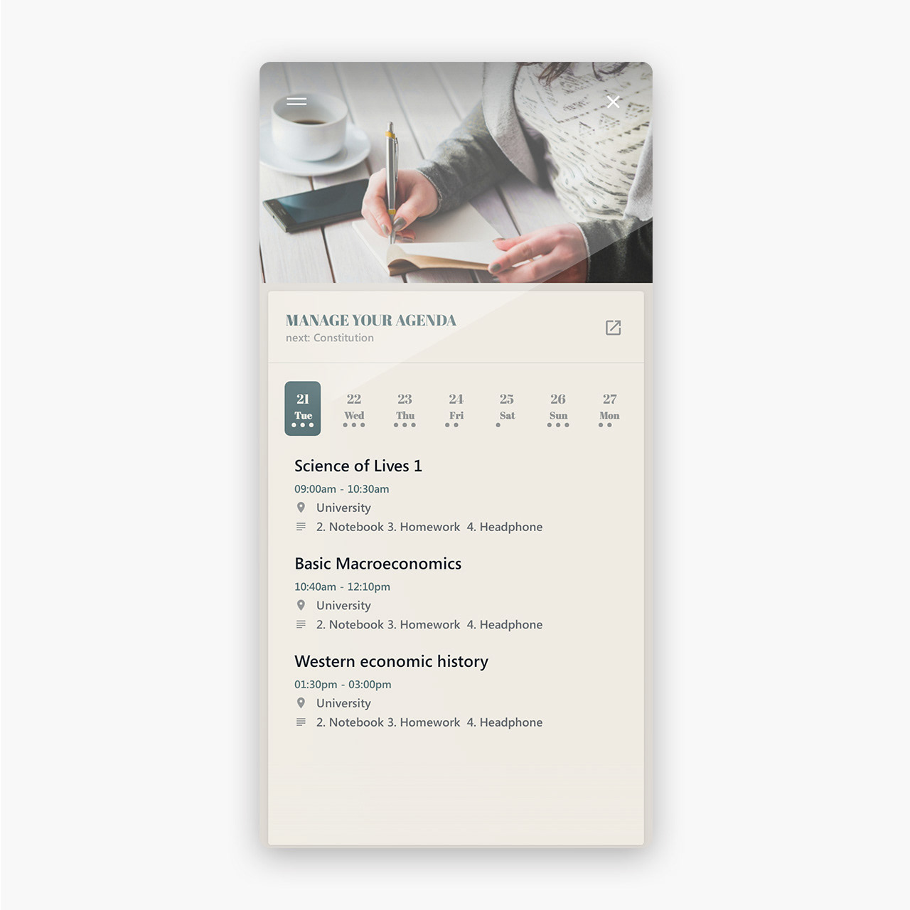 ニュース・音楽・天気・スケジュールをカード型UIに整理した、情報美しさを両立させたKLWPホーム画面テーマです。ベージュとアイボリーを基調とした落ち着いたカラーパレットで、どんな壁紙とも自然になじむ洗練されたデザインを実現しています。各機能はカードとして独立しており、タップするたびに整然としたパネルが展開します。