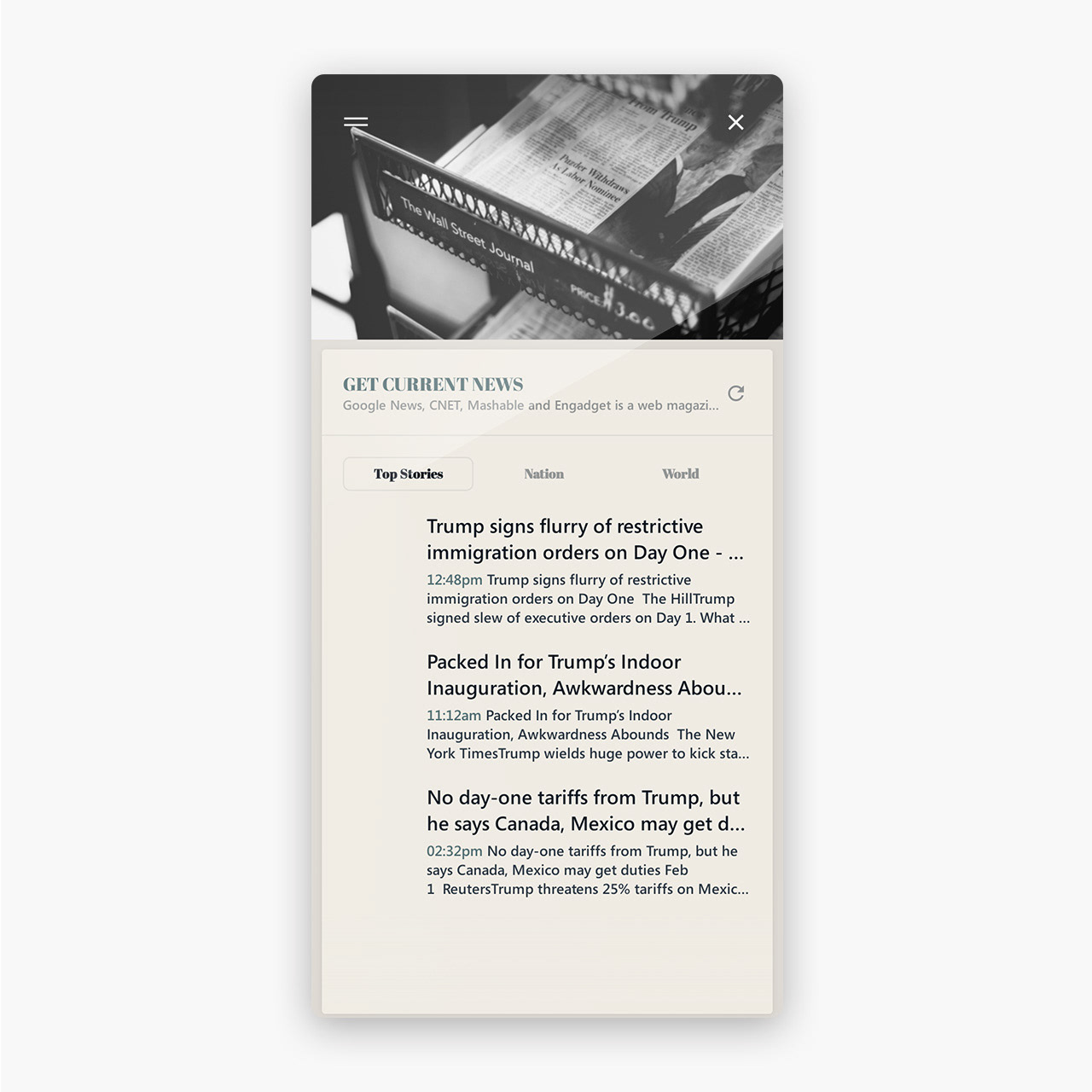 Google News・CNET・Mashable・Engadgetなど複数のRSSソースからニュースを取得し、「Top Stories」「Nation」「World」のタブで切り替えて閲覧できます。記事タイトル・配信時刻・本文プレビューをまとめて確認でき、朝の情報収集をホーム画面から完結させます。